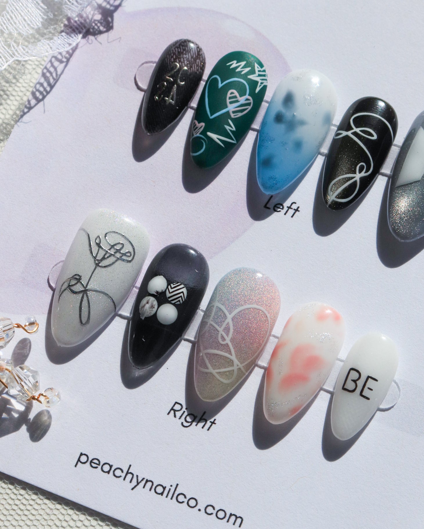 If using "custom" sizing, please let us know the measurements in the instruction box at the checkout, or if you have purchased our sizing kit, please write what number each finger corresponds to with the correct number on the press-on.