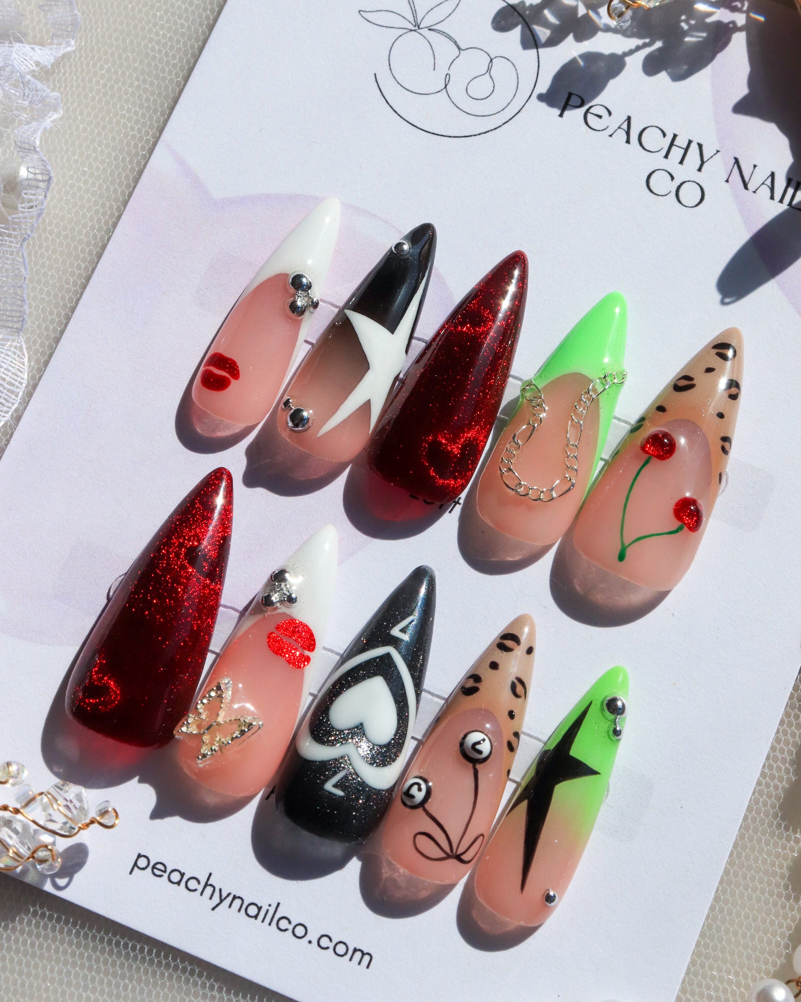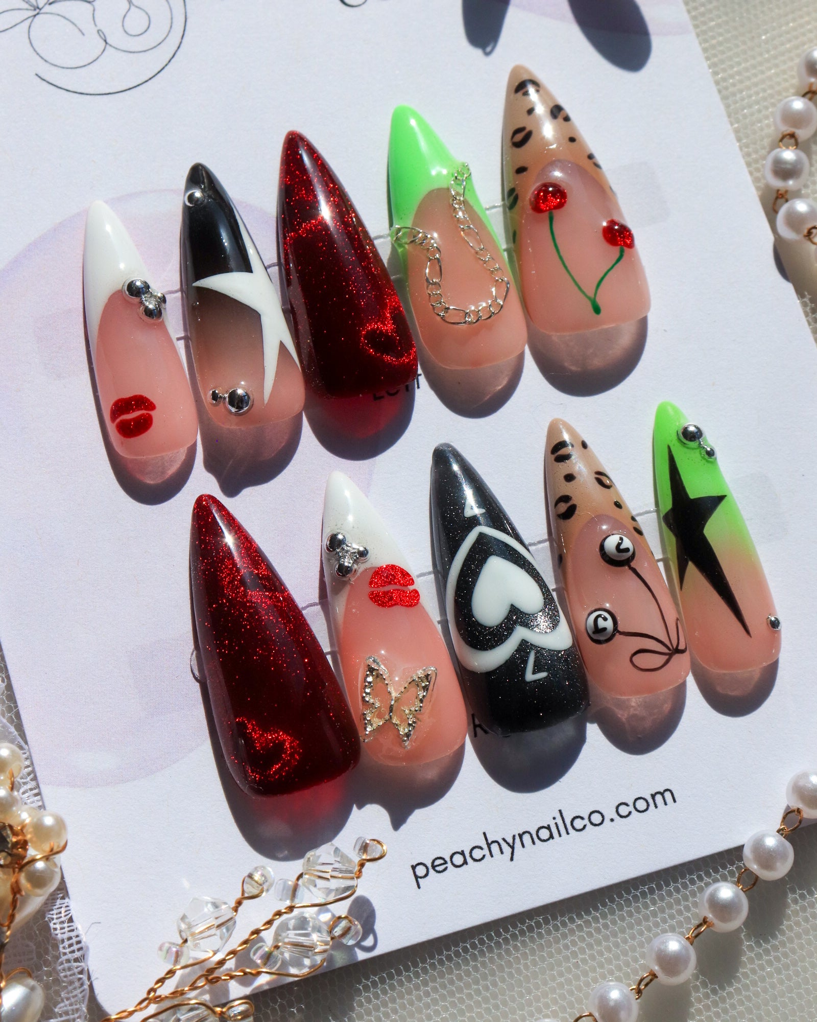 Each nail set comes with 10 nails in the chosen shape and sizes, and a free nail pack that includes: