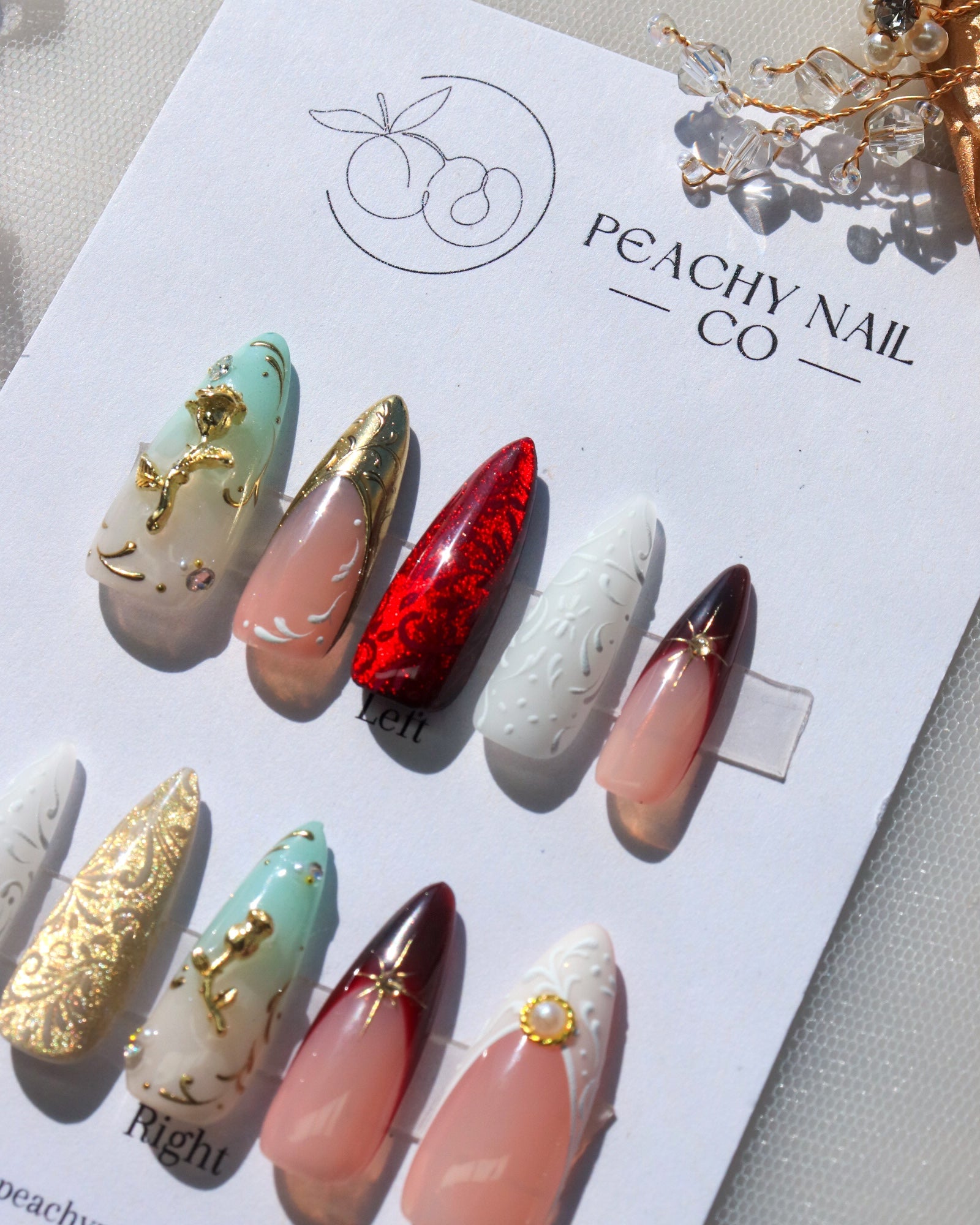 Each nail set comes with 10 nails in the chosen shape and sizes, and a free nail pack that includes: